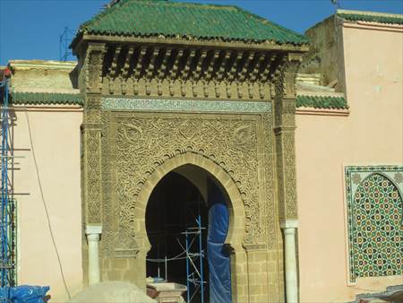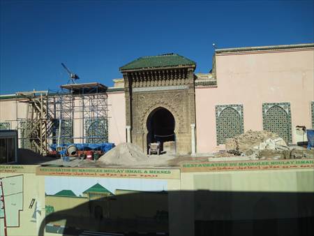 ムーレイ・イスマイル廟。残念ながら、この時は修復作業中でバスの窓からの見学となりました。
