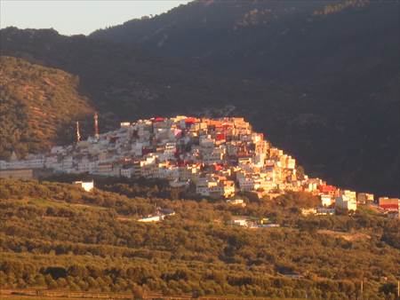 遺跡から見た、「ムーレイ・イドリス」の町です。白い家並みが並んでいる、「聖者の町」といわれる古都です。