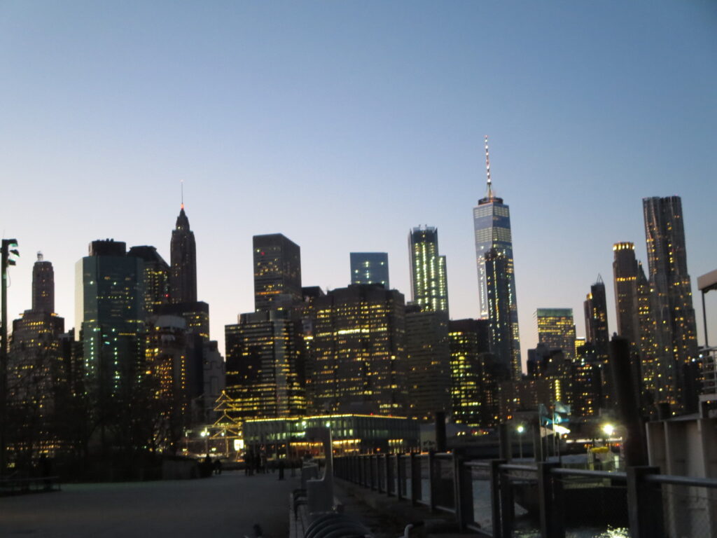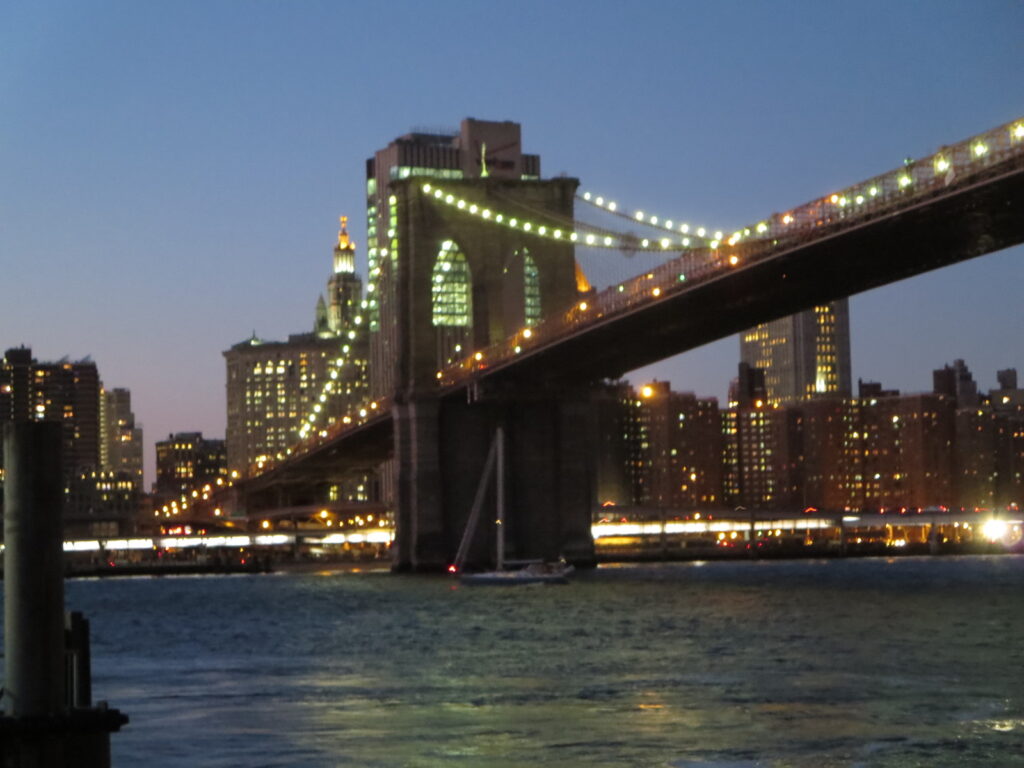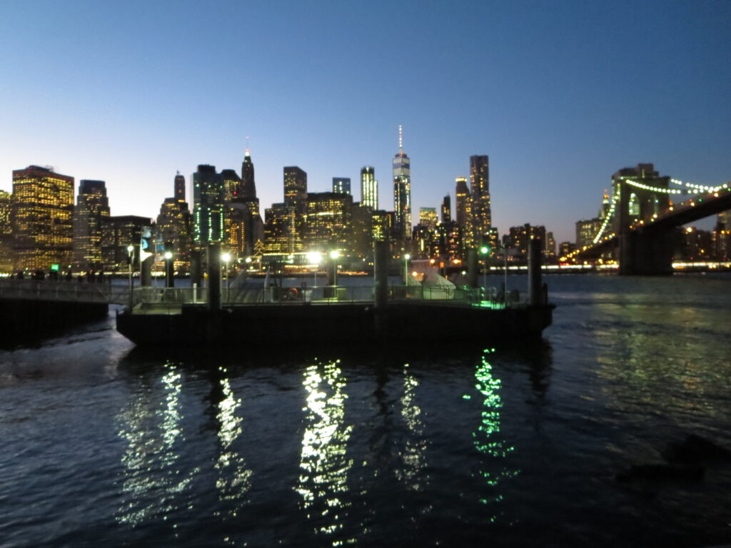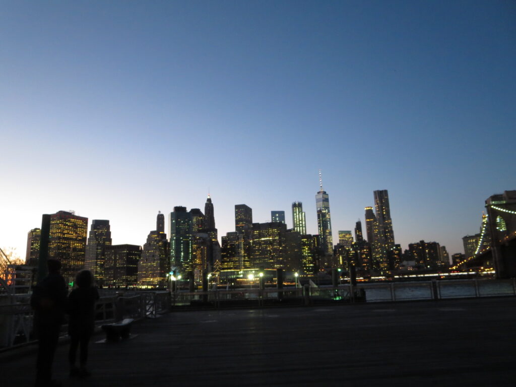 日が沈み、ブルックリン・ブリッジとマンハッタンの夜景が綺麗でした。