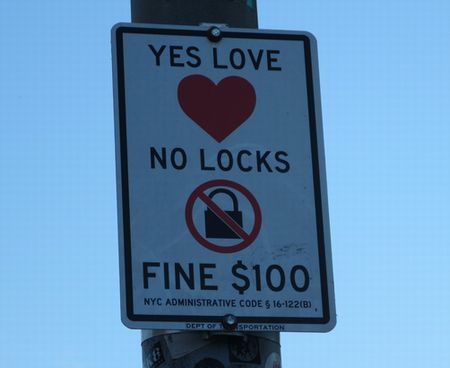 寒いブルックリン・ブリッジを渡り、ダンボへ。橋の途中にあった看板「NO LOCKS」