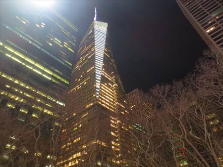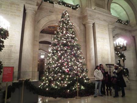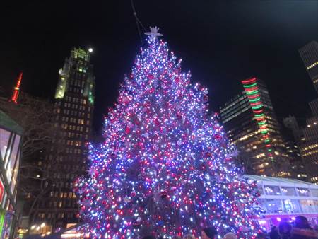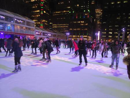 大きいクリスマスツリー。クリスマスの日は盛大なイベントがある場所です。このブライアントパークには屋外のスケート場があります!冬の間だけオープンしていて無料です。ただし、貸靴が$20!