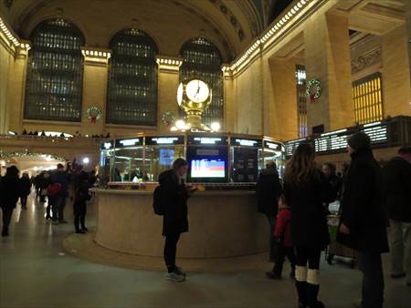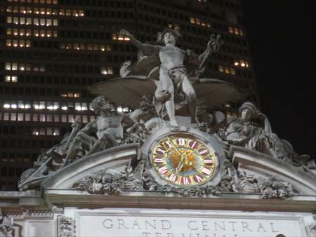 高層ビルの夜景を眺めながら、ニューヨークの中心部にある、グランド・セントラル駅Grand Central Stationです。正面にあるヘルメス像と、その両脇のヘラクレス像とアテナ像。これはフランスの彫刻家、ジュール・アレクシス・クータンにより作られた作品です。この大時計、直径約4mあって、ティファニー製のガラスが使用されているそうです!