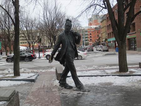 こちらの、コートを肩に掛けて歩く人の像は、ケヴィン・H・ホワイト市長です。