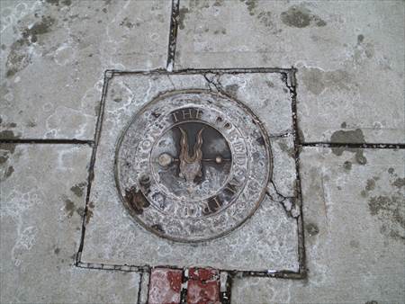 足元には、マンホールではなく、このようなプレートと、赤煉瓦で示された全長約4kmの赤い線に沿って16ヶ所の史跡があります