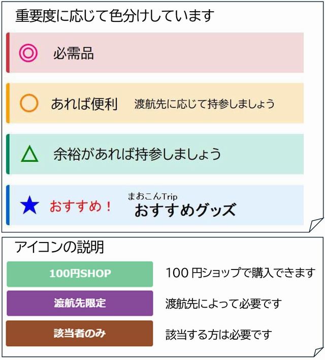 本人用と留守宅(家族等)用を用意する。個人手配の旅行の場合も、日程・便名・滞在先(国・都市名)・ホテル名・ホテルの電話番号などを明記したメモを作成することが望ましいです。