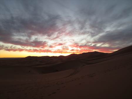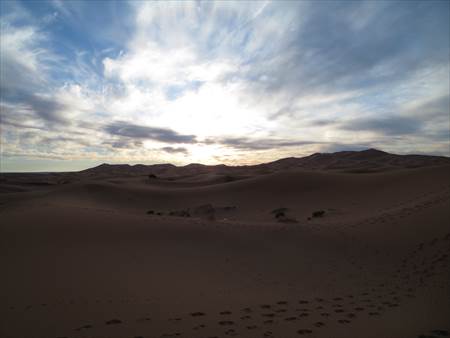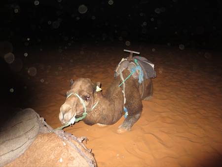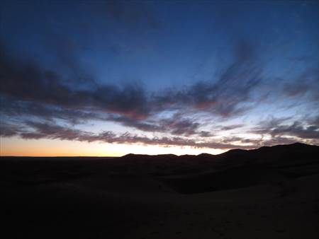 4WDの車で暗闇の舗装された道路を30分ほど走り、その後、道なき道、というか、砂漠の中をガタゴトと10分ほど走り、メルズーガの砂漠に到着。