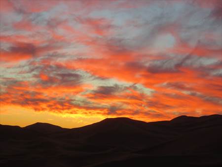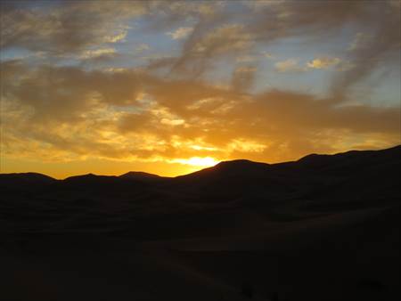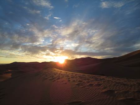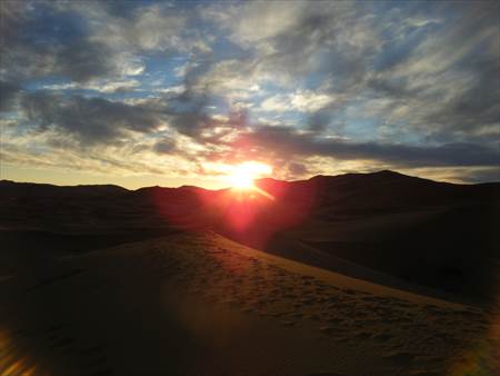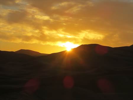 まわりに砂しかない砂漠の中で、日の出を待つ間、とても寒かったです。気温4度。
