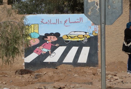 壁の絵。たぶん、「道路を渡るときは横断歩道を渡りましょう」という意味だと思います。