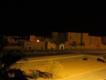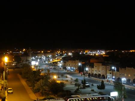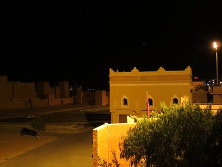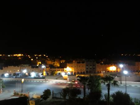 ワルザザードに到着し、ホテルの屋上(といっても2階建て)からの夜景です。ホテル前のムハンマド5世通り。