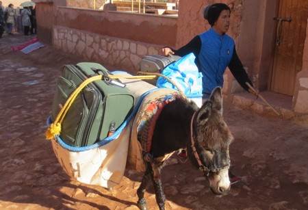 たぶん、4輪車とかは「ダメ」と書いてあるのだと思います。なので、荷物はロバが運んでいます。