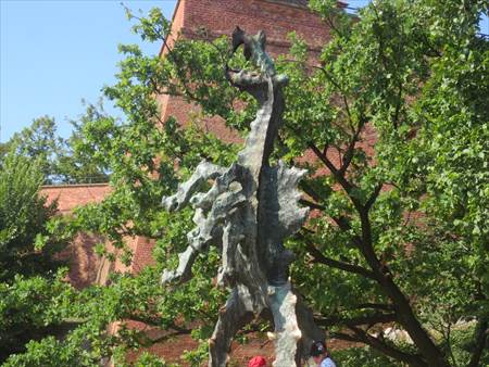 この「竜」は昔、ヴィスワ河畔の洞窟には獰猛な竜が住んでいて、若い娘や家畜を襲って人々を不安に陥れていました。そこで靴職人の弟子クララは、硫酸とタールを染み込まれた羊を用意しました。その羊を飲みこんだ竜は喉が渇いたので川の水を飲み続け、遂に腹が破裂してしまった、という言い伝えがあります。