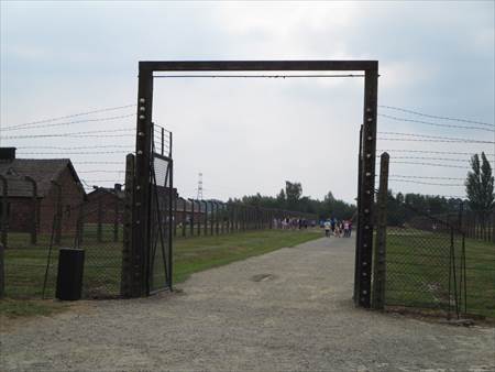 収容所の入口。入口のゲートには「ARBEIT MACHT FREI」働けば自由になる、という文字が掲げられている。