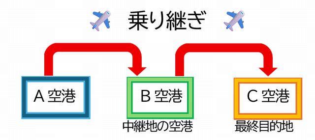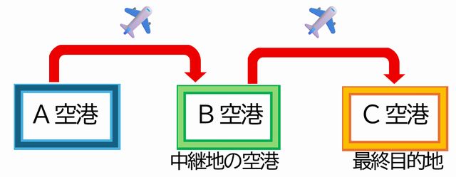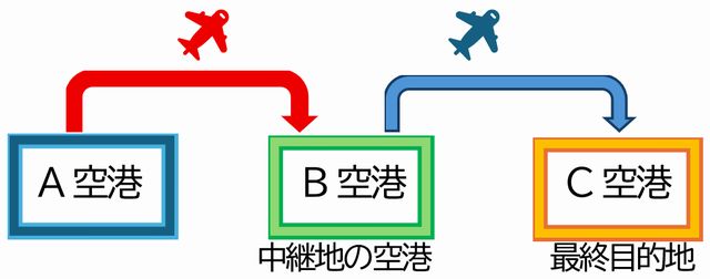 A空港からC空港(最終目的地)へ向かう際に、途中で中継地の空港(B空港)を経由する場合が、経由便や乗り継ぎ便になります。