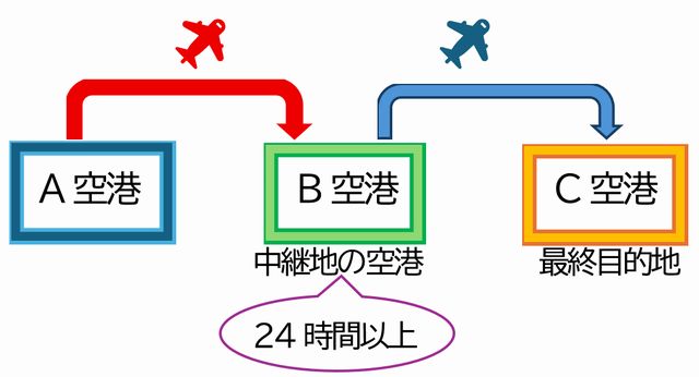 ストップオーバー(stopover)とは、中継地の空港(B空港)での滞在時間が24時間以上になることです。
